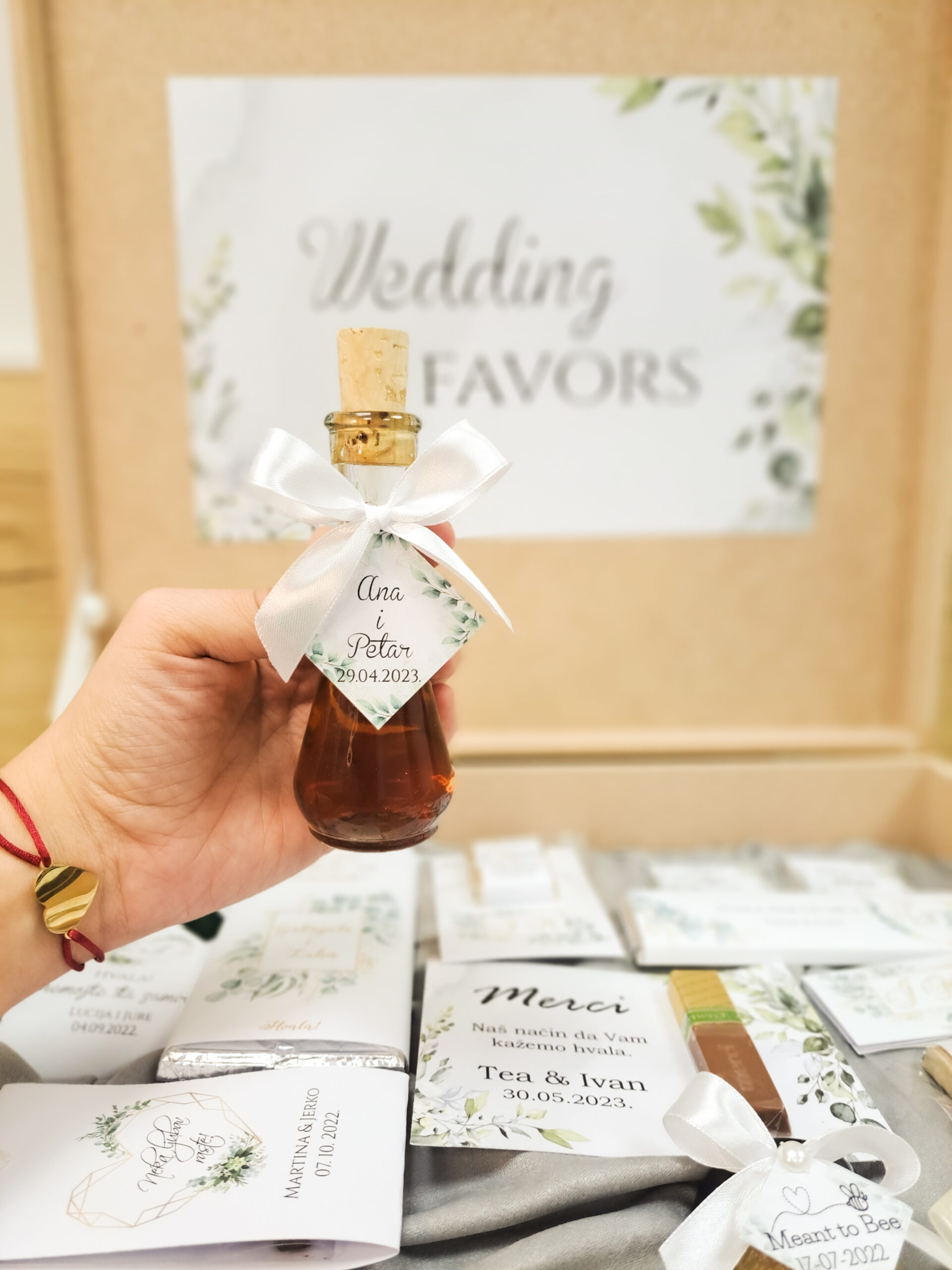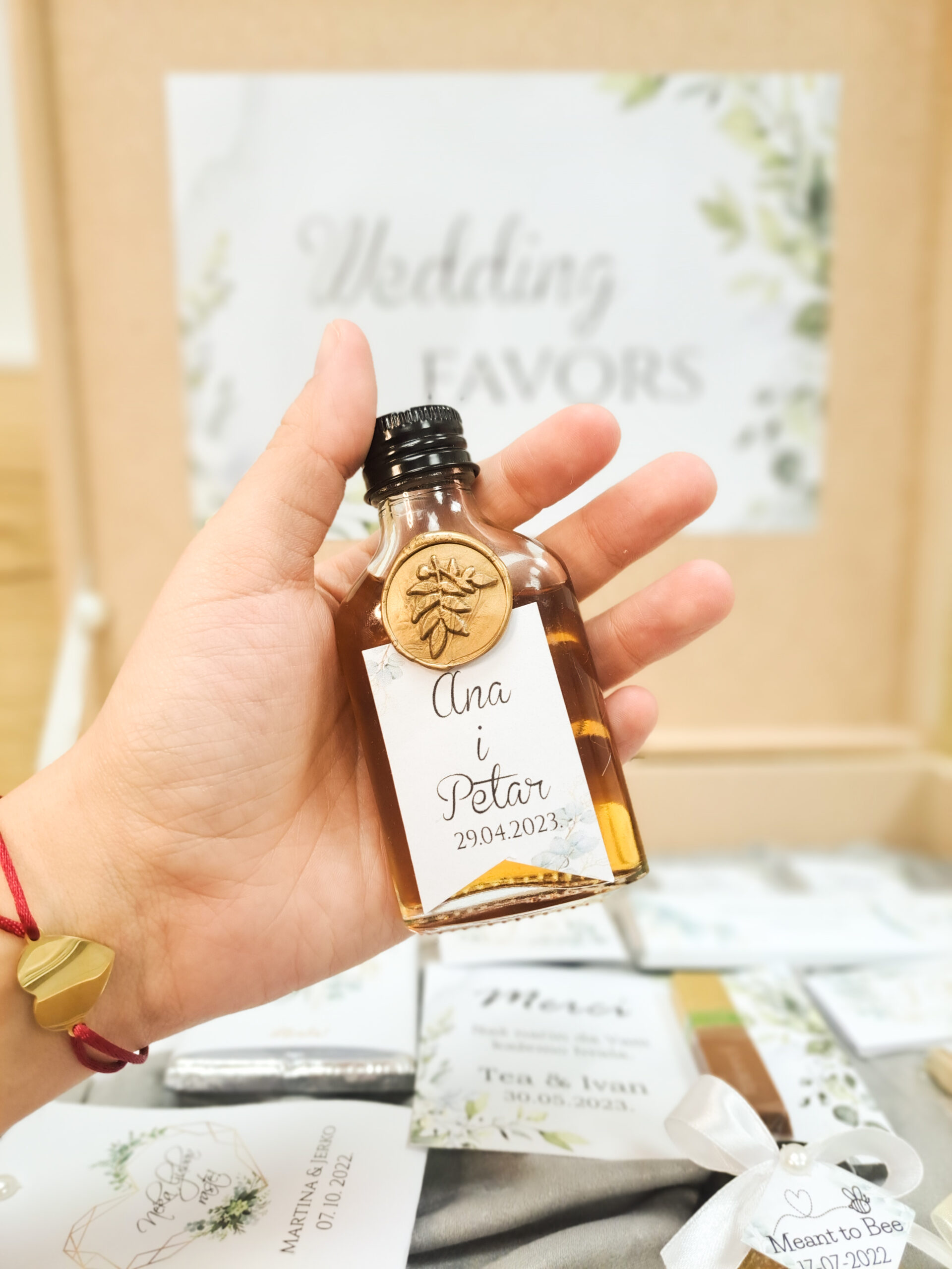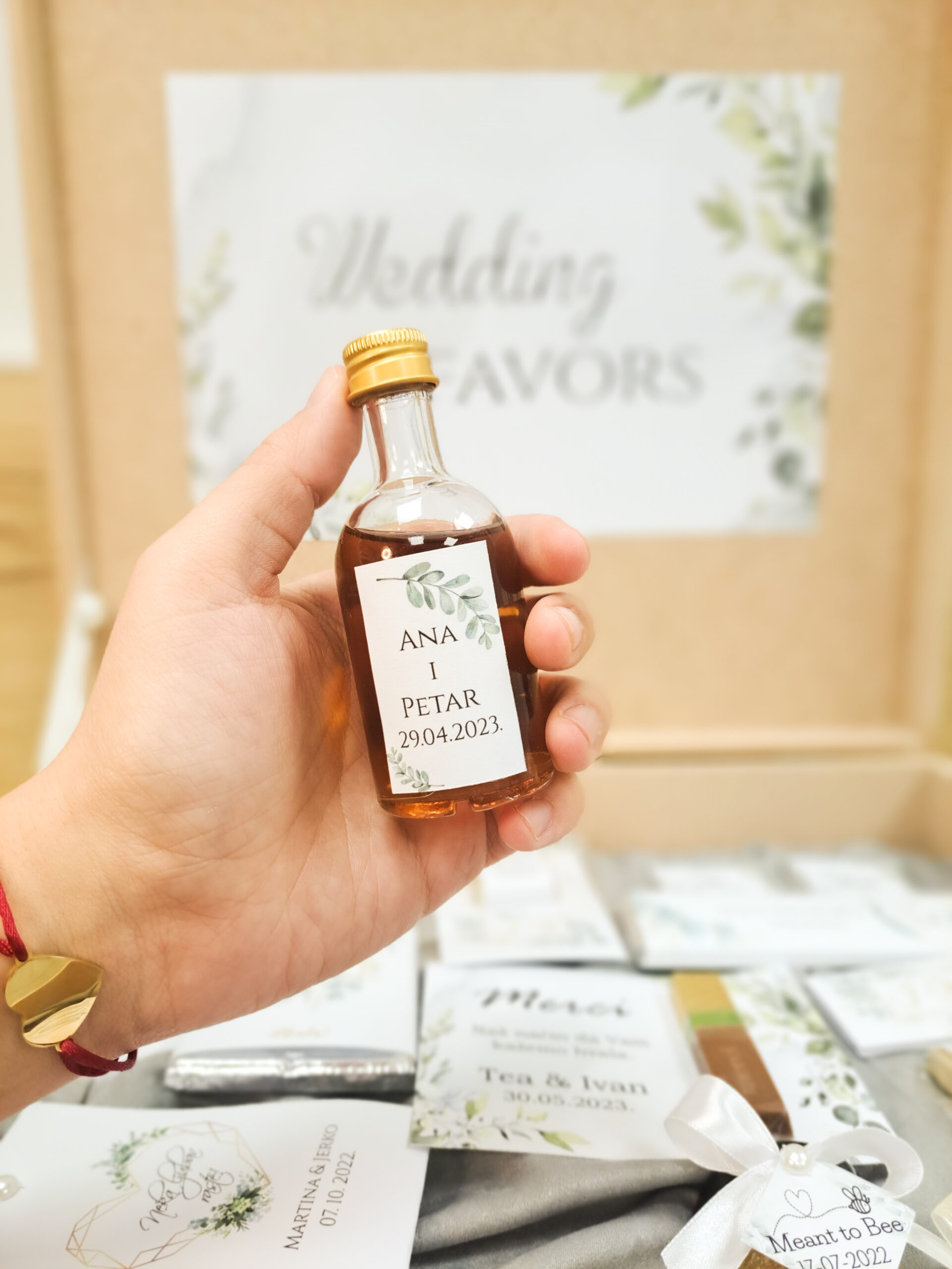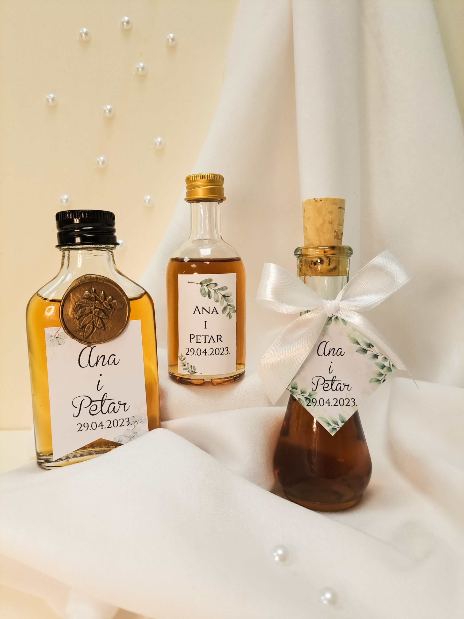 Zahvaliti svojim gostima možete i uz personalizirane mini bočice ili čokalje, punjene likerima, rakijom, maslinovim uljem  ili drugim punjenjem po izboru. Ovi mali, ali posebni darovi dodaju dozu luksuza, ali i tradicije svakom slavlju.