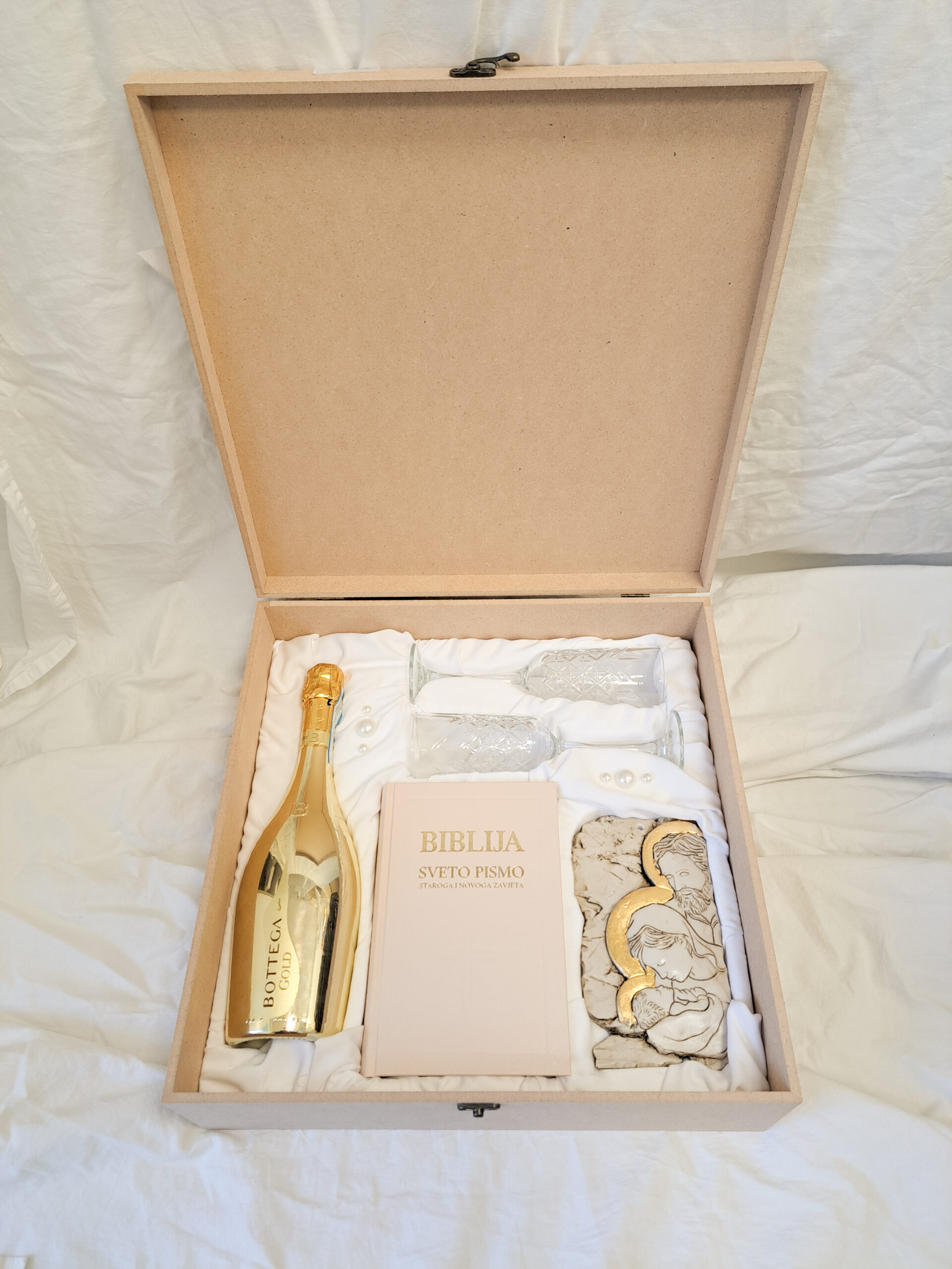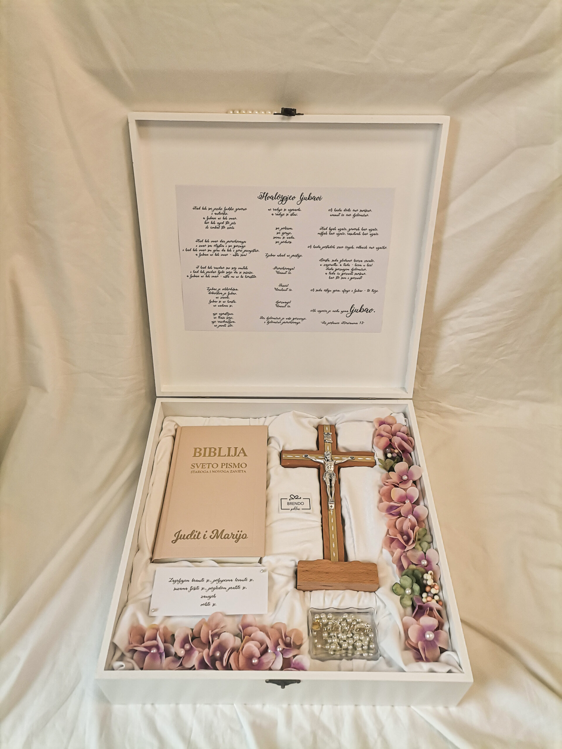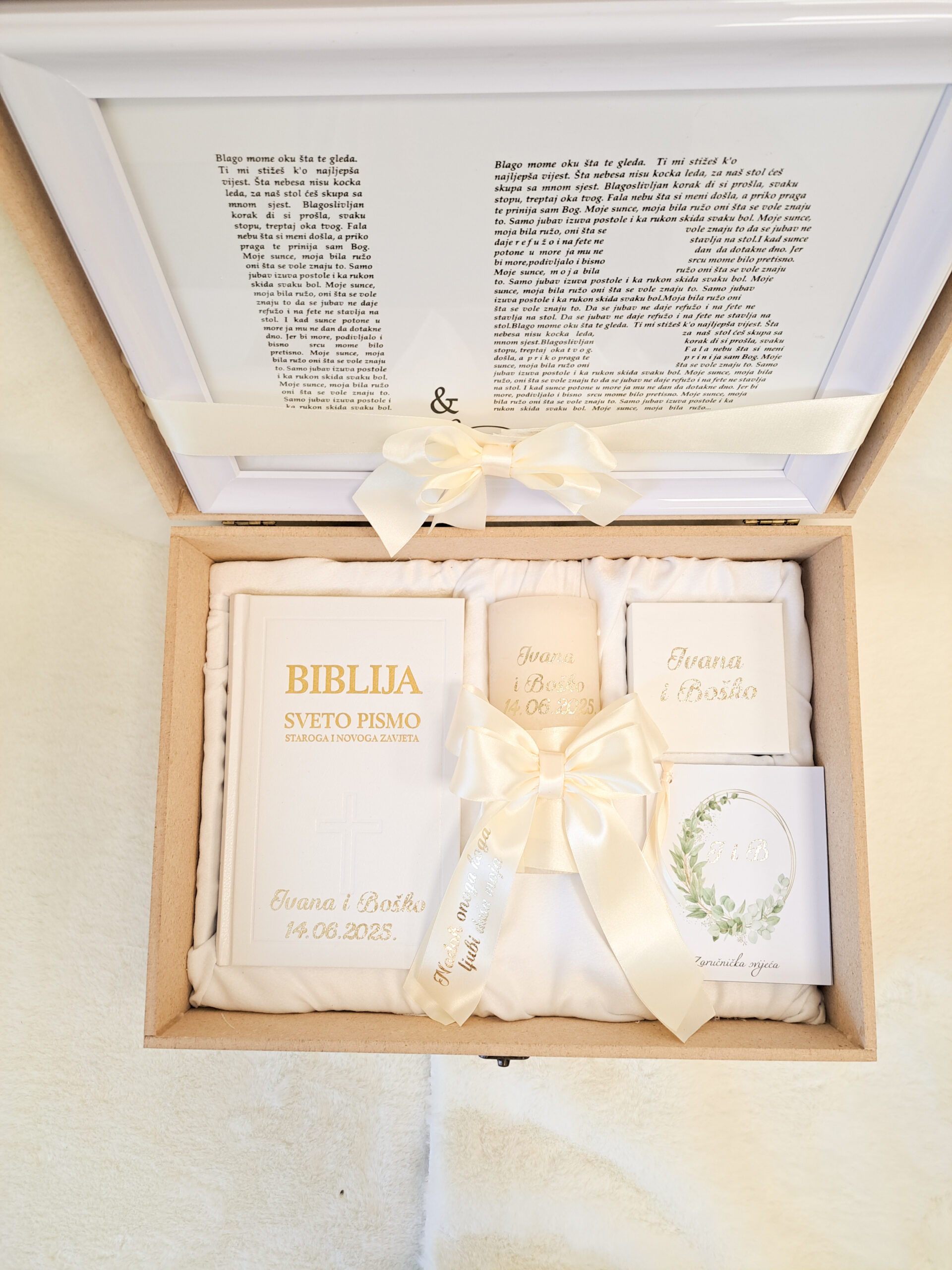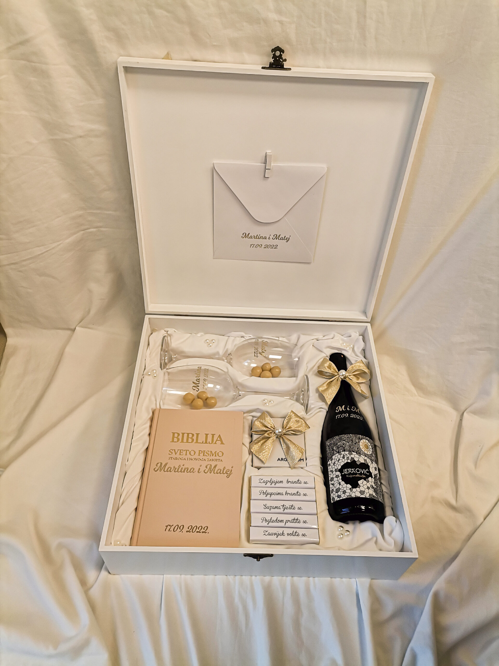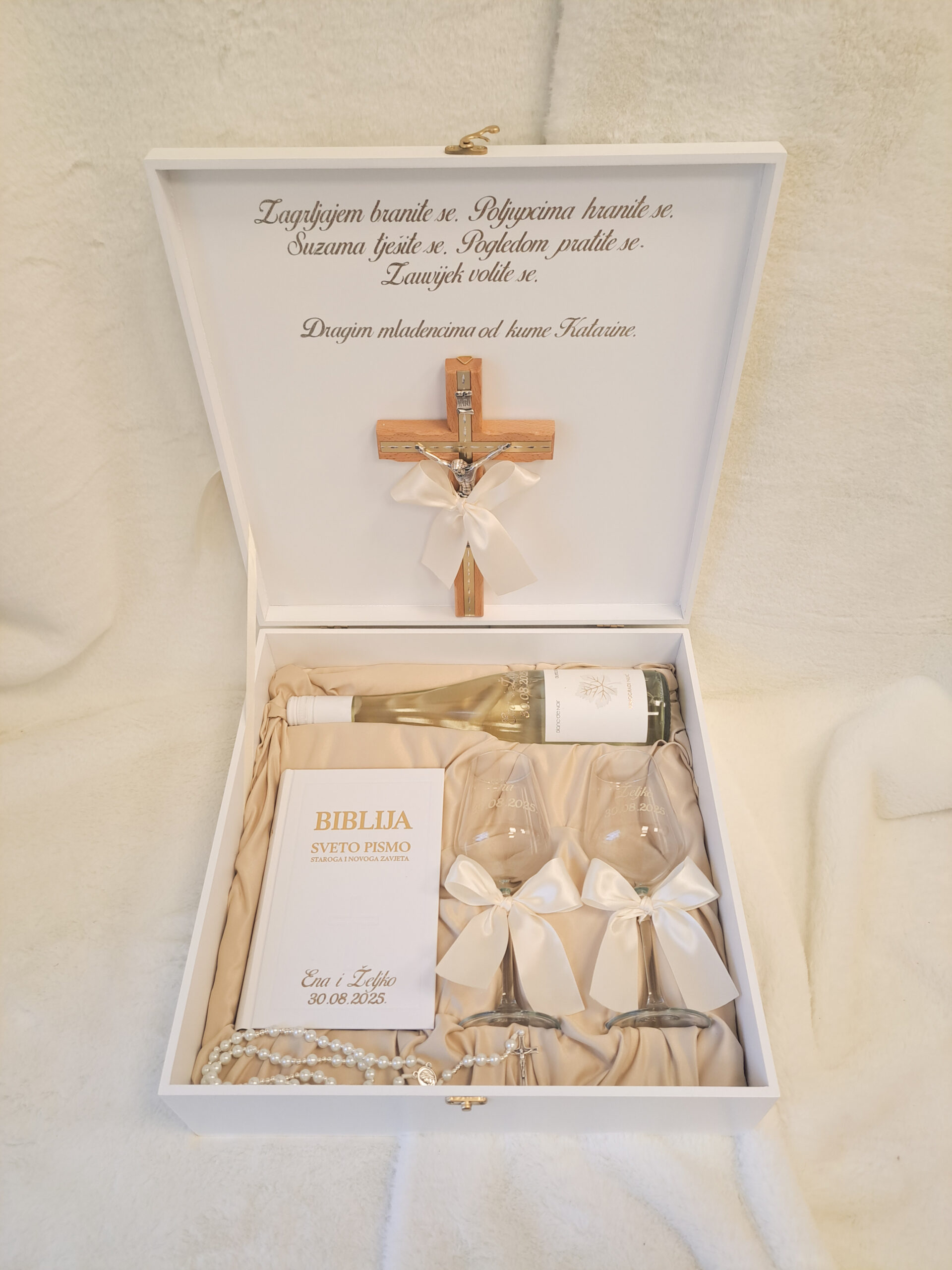 Poklon paketi za vjenčanje najčešće uključuju: Bibliju, križ,krunicu, svijeću. Sljedeća najčešće birana opcija su pokloni sa pićima, čašama i slatkišima i/ili drugim delikatesama, a mogu sadržavati i neki konkretniji poklon za mladence poput parfema ili nakita. Svaki detalj je pažljivo osmišljen i izrađen. Poklone pakiramo u luksuzne kutije i nudimo mogućnost potpunog brendiranja i personalizacije.