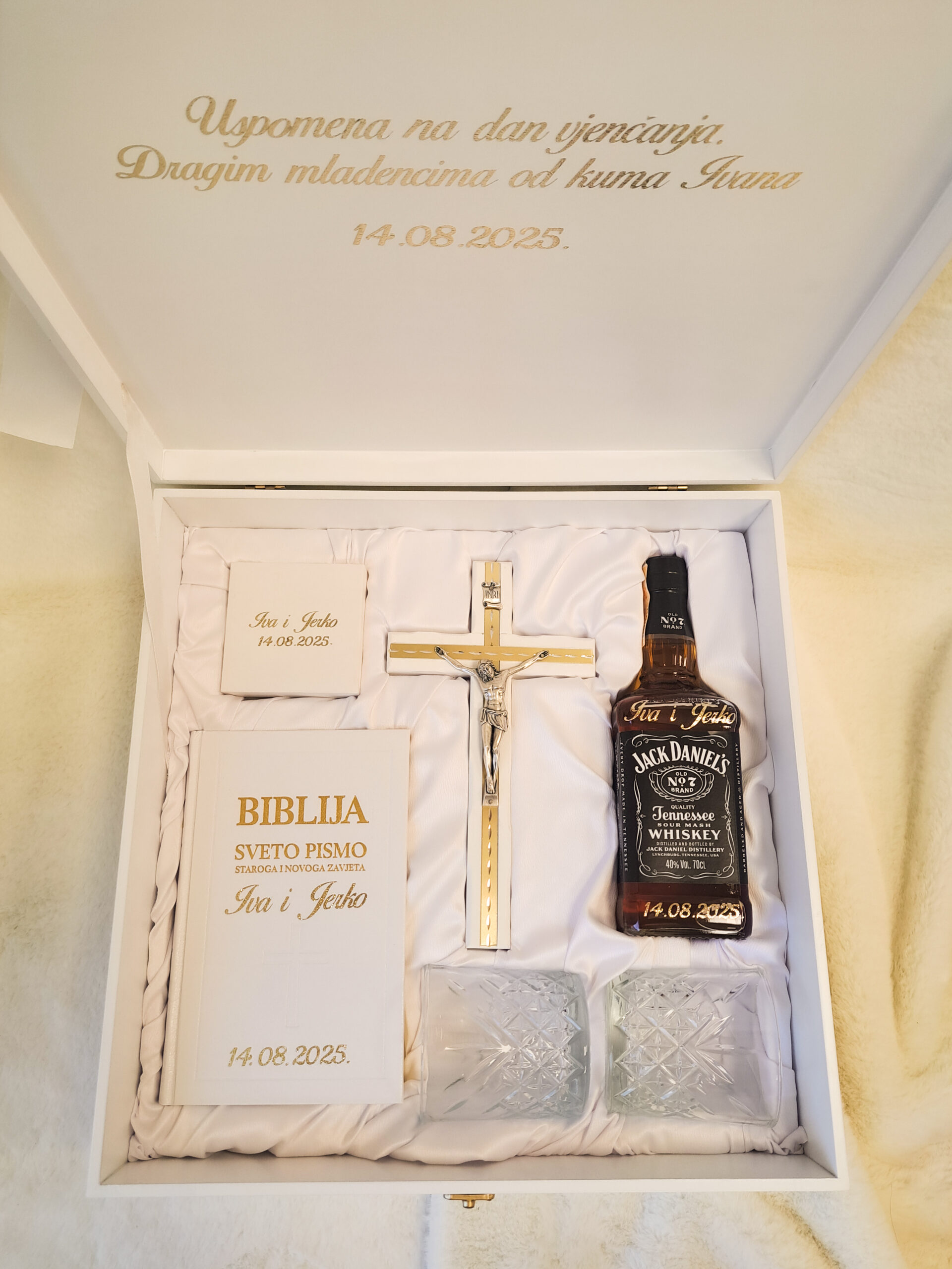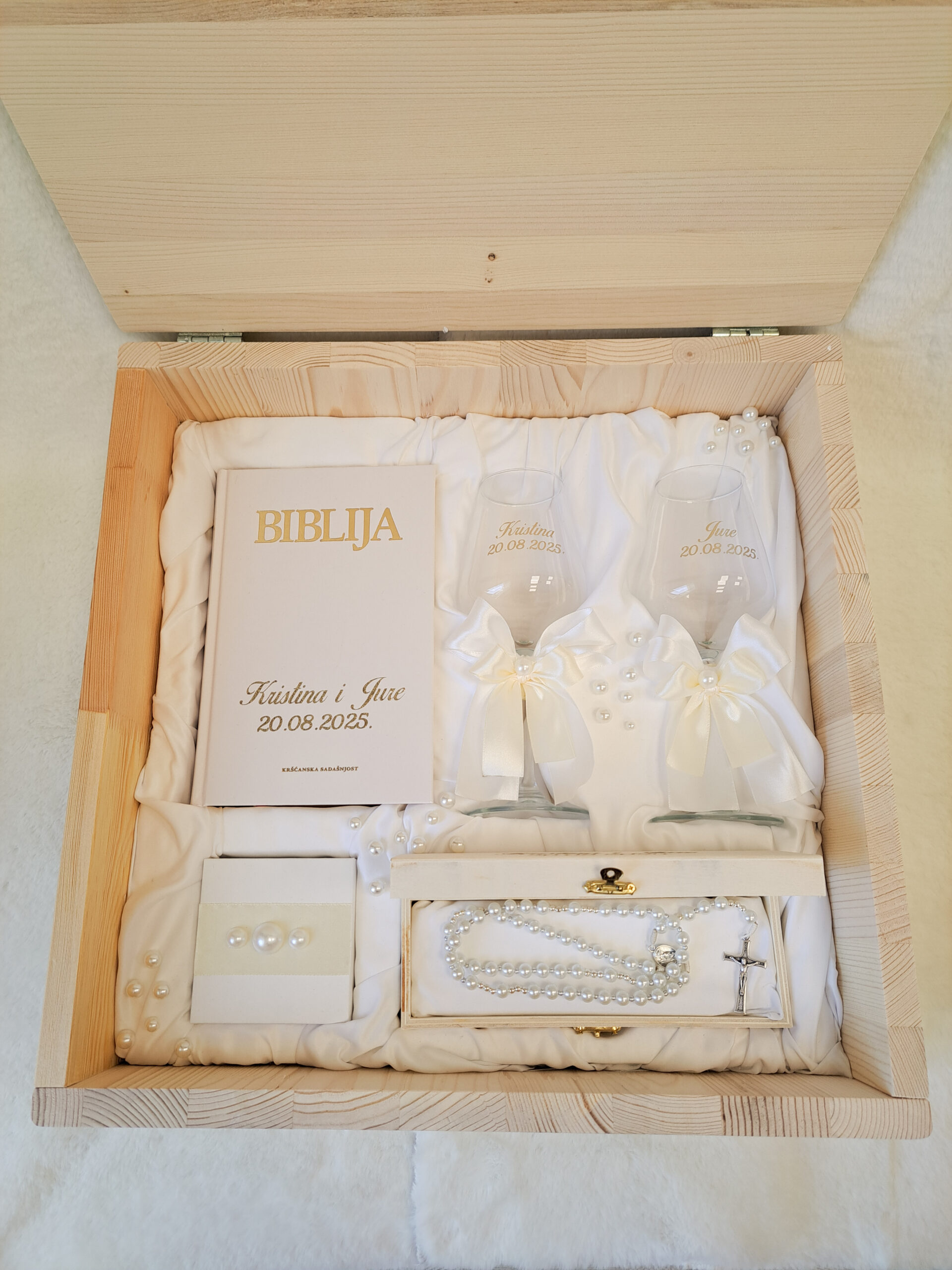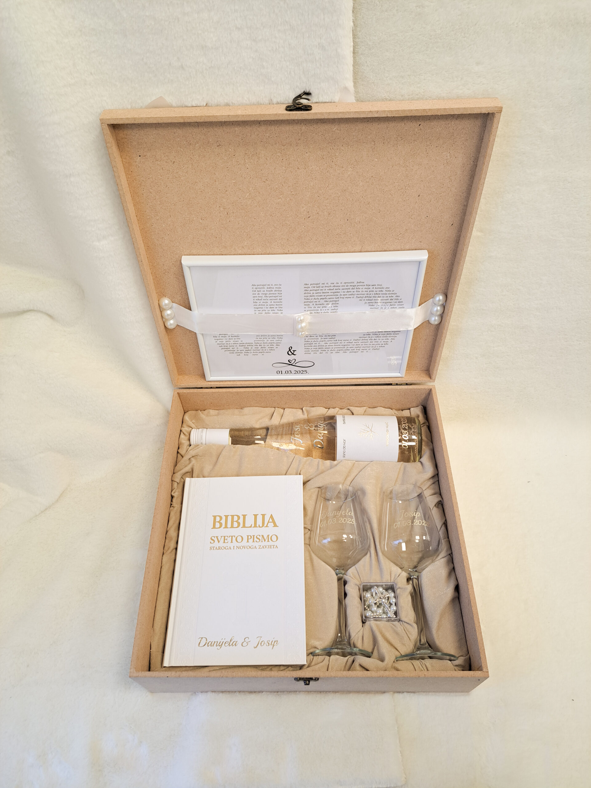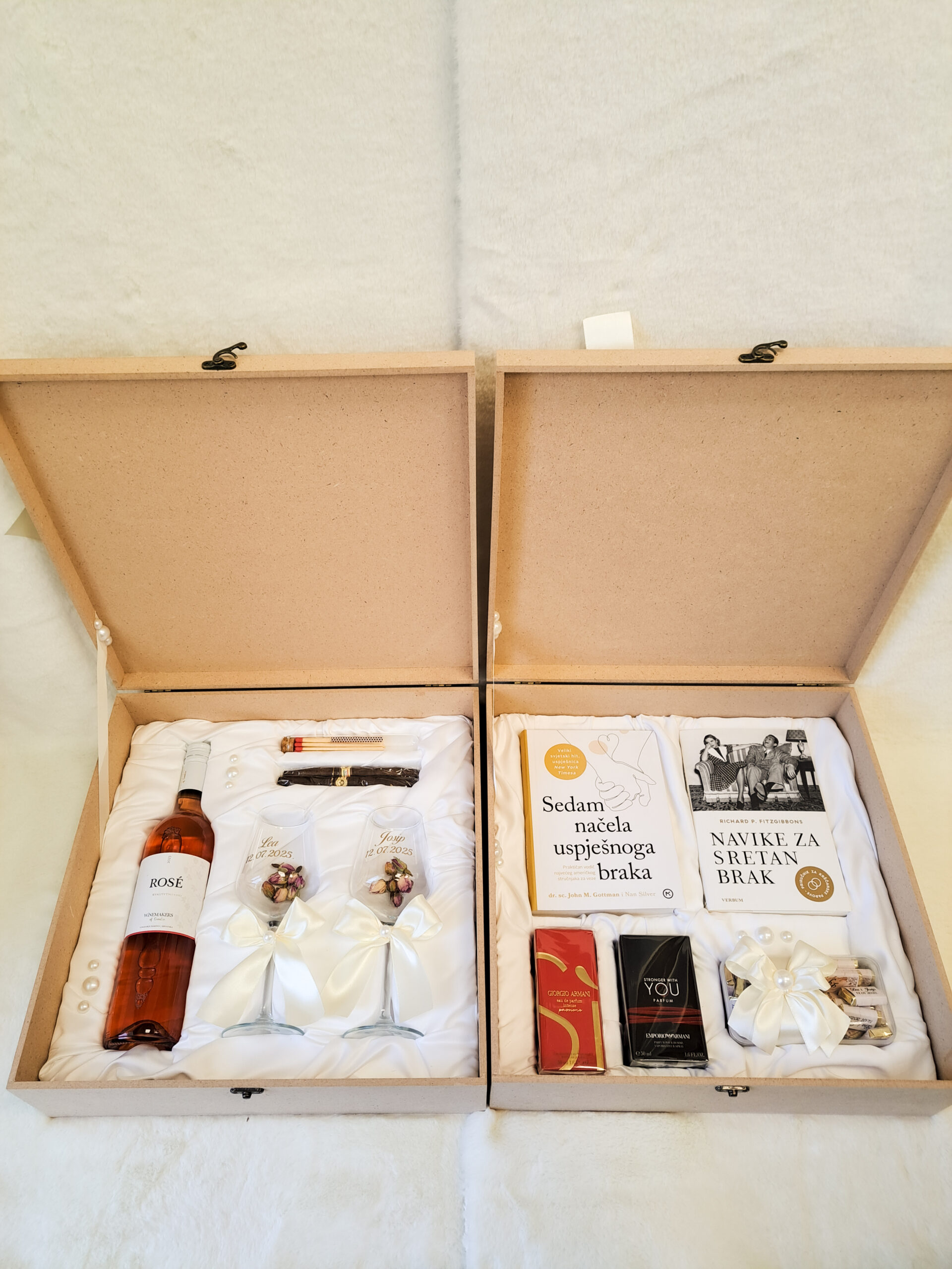 Poklon paketi za vjenčanje najčešće uključuju: Bibliju, križ,krunicu, svijeću. Sljedeća najčešće birana opcija su pokloni sa pićima, čašama i slatkišima i/ili drugim delikatesama, a mogu sadržavati i neki konkretniji poklon za mladence poput parfema ili nakita. Svaki detalj je pažljivo osmišljen i izrađen. Poklone pakiramo u luksuzne kutije i nudimo mogućnost potpunog brendiranja i personalizacije.