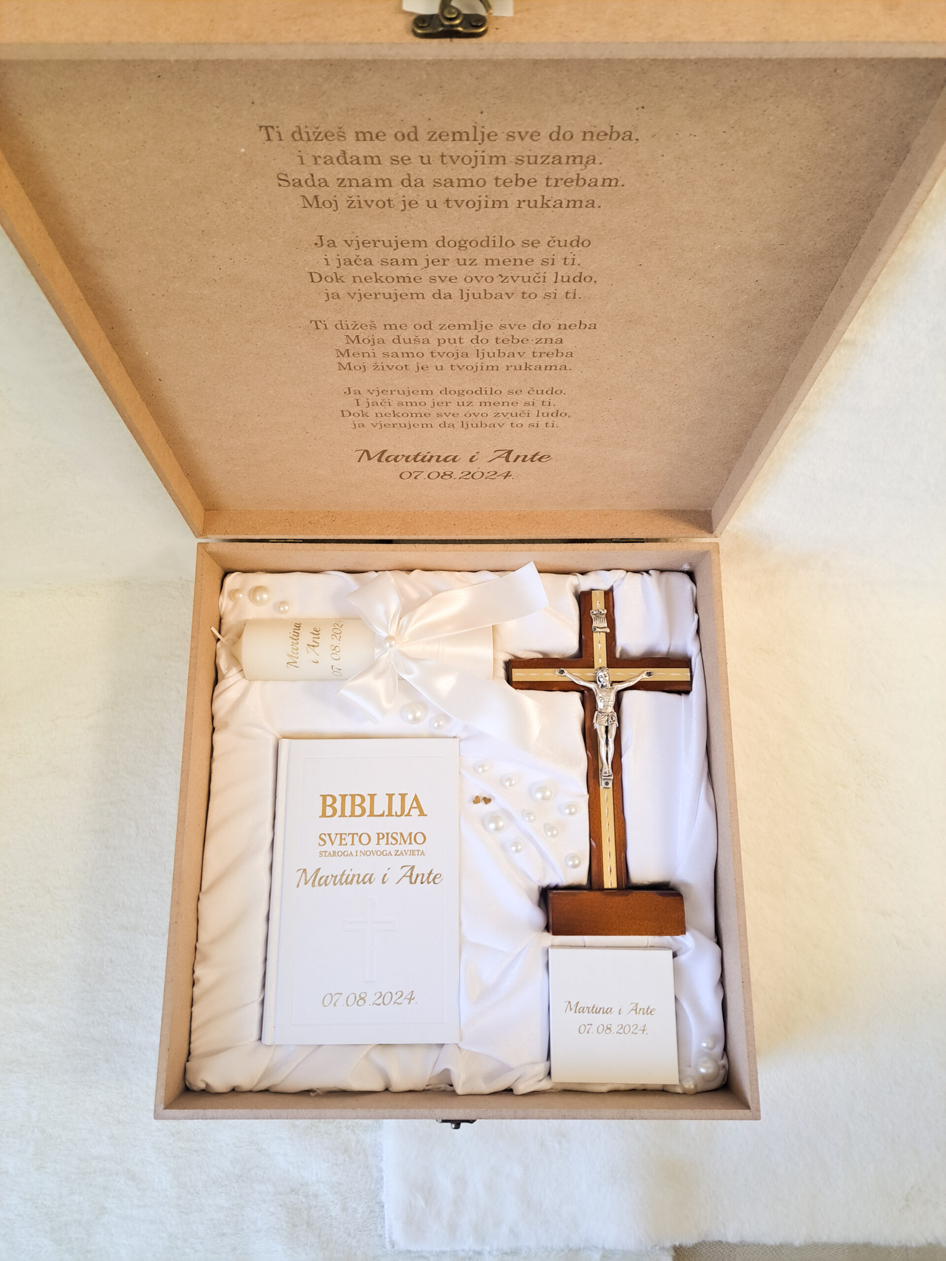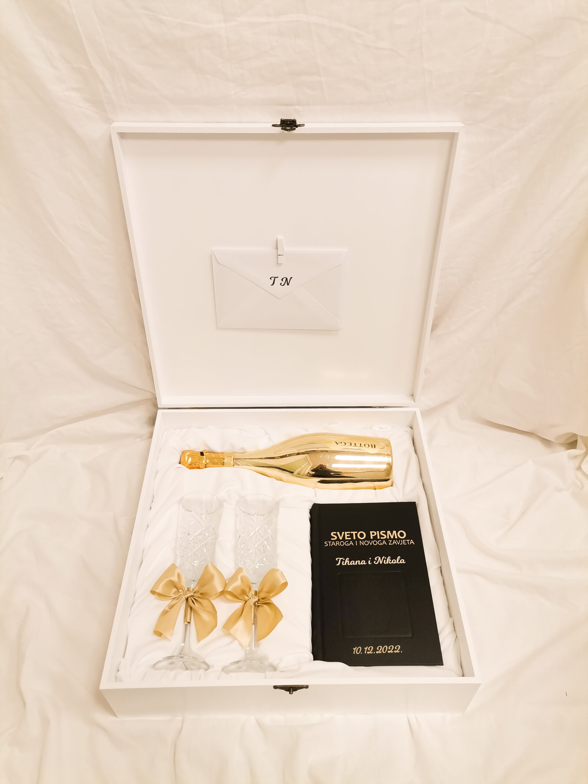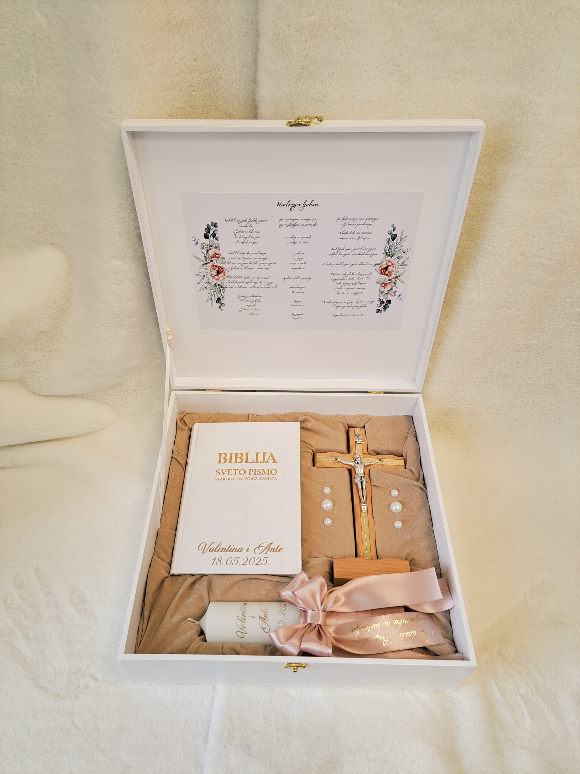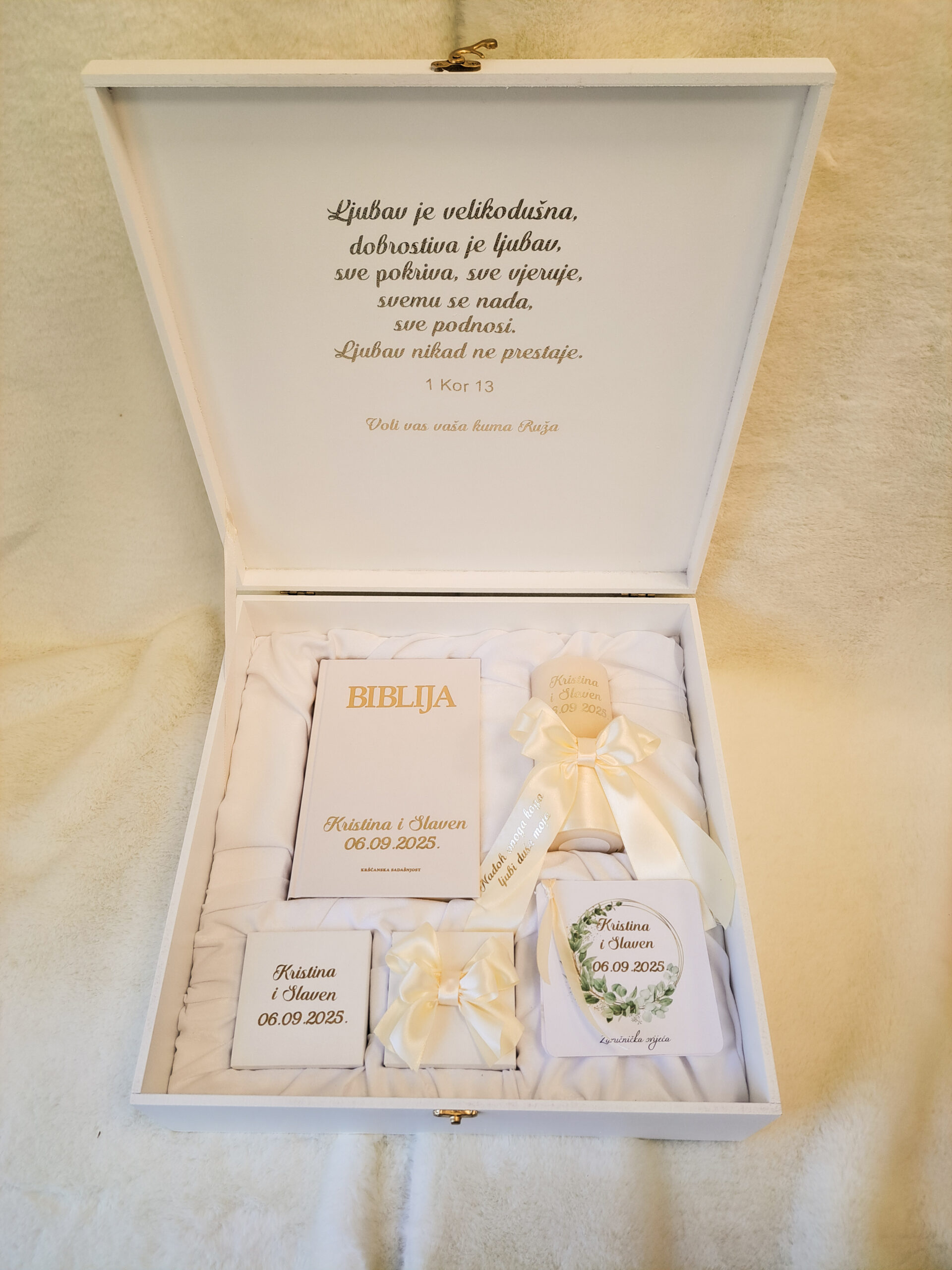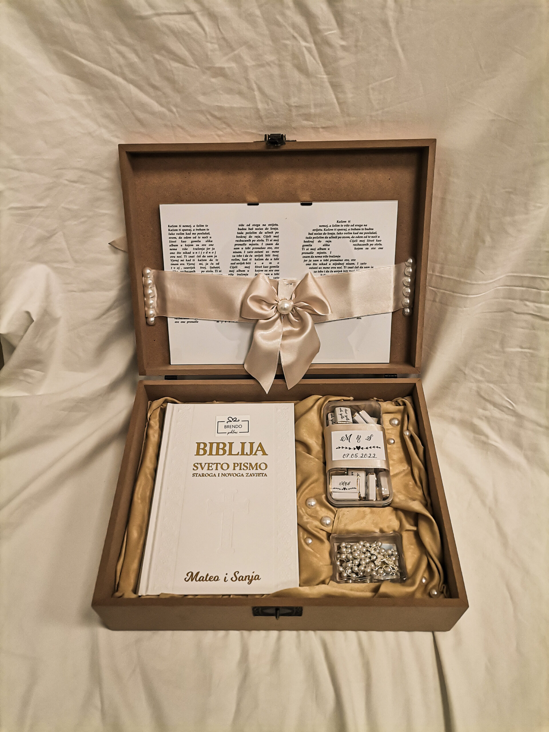 Poklon paketi za vjenčanje najčešće uključuju: Bibliju, križ,krunicu, svijeću. Sljedeća najčešće birana opcija su pokloni sa pićima, čašama i slatkišima i/ili drugim delikatesama, a mogu sadržavati i neki konkretniji poklon za mladence poput parfema ili nakita. Svaki detalj je pažljivo osmišljen i izrađen. Poklone pakiramo u luksuzne kutije i nudimo mogućnost potpunog brendiranja i personalizacije.