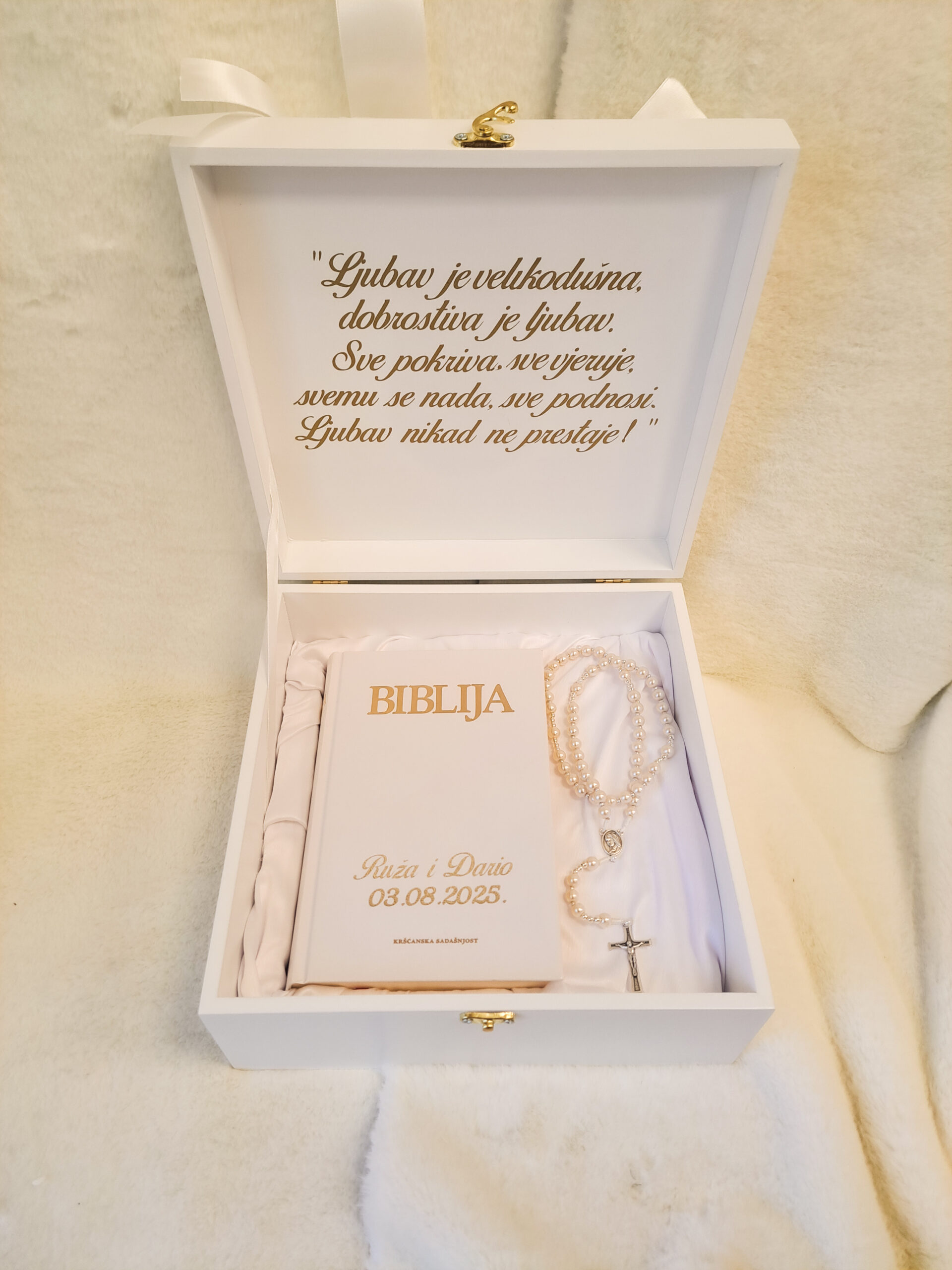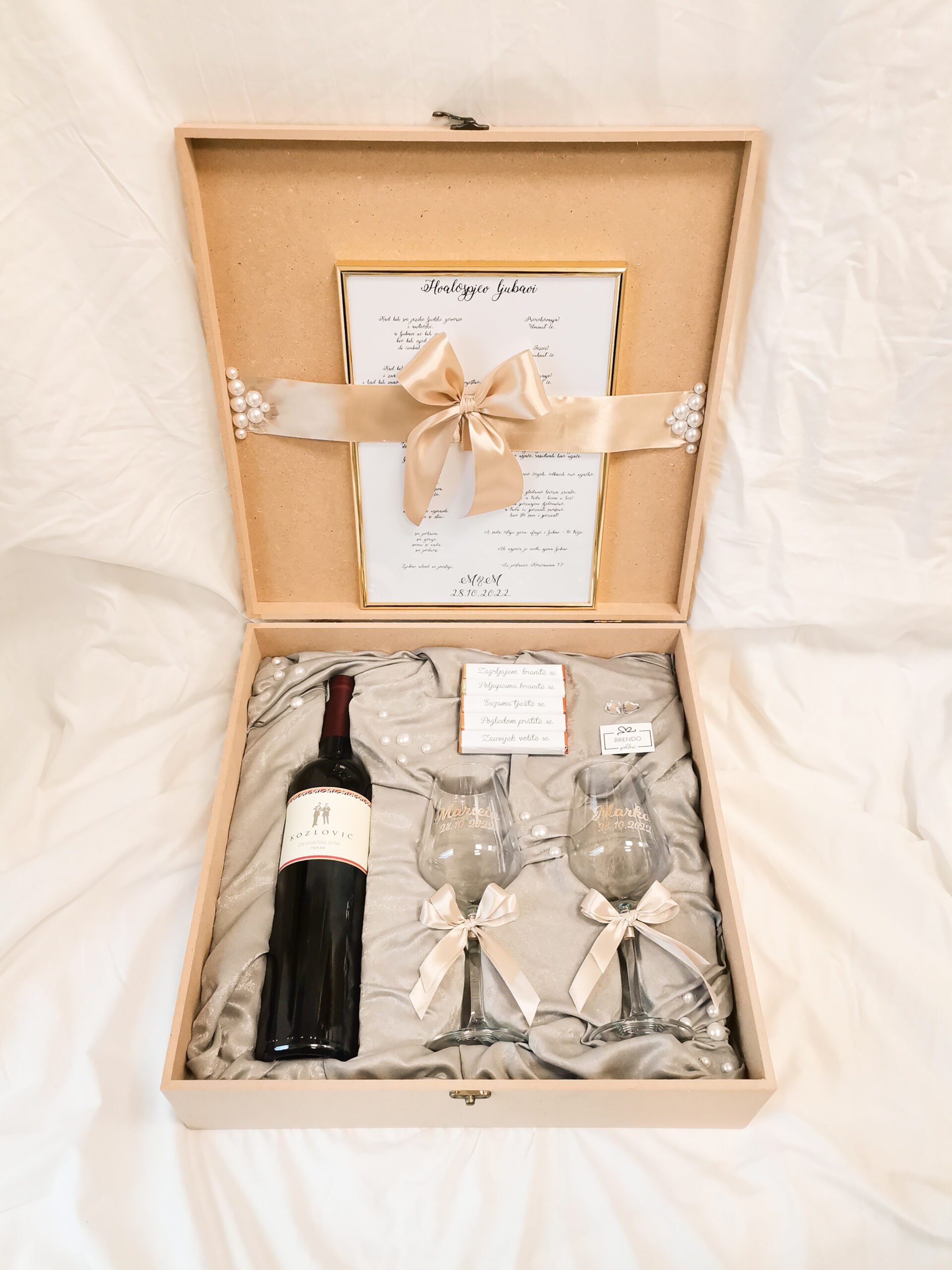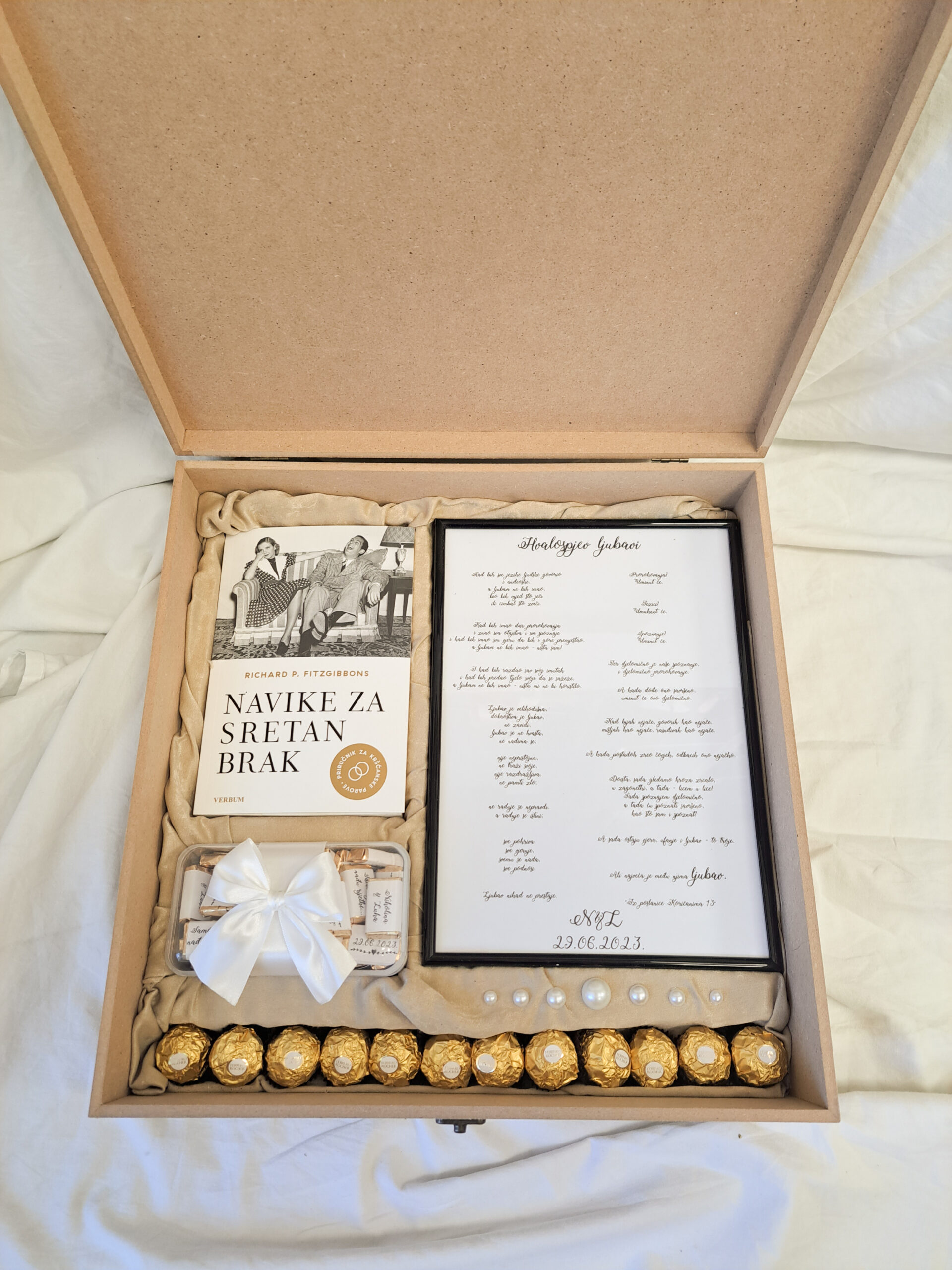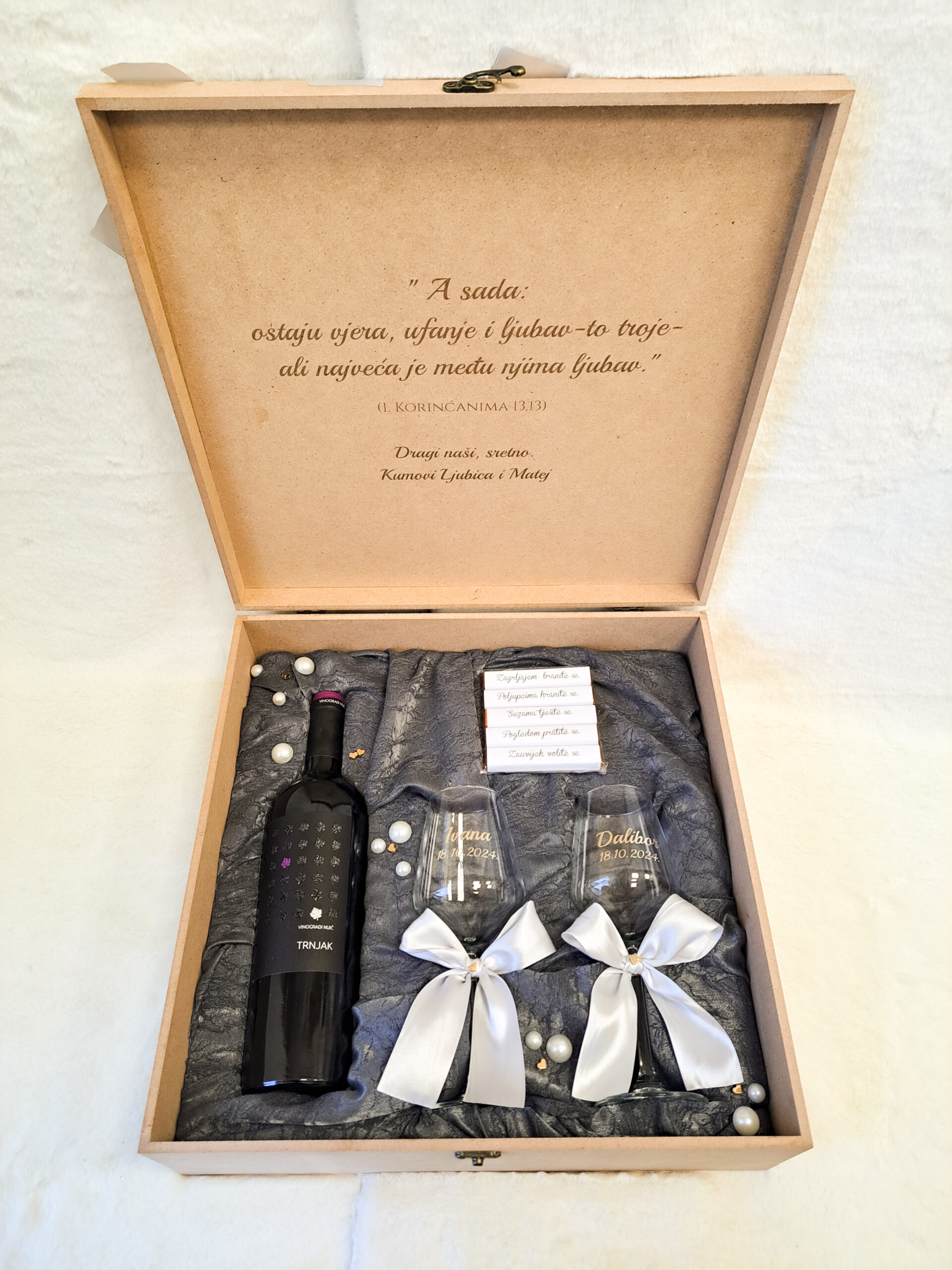Poklon paketi za vjenčanje najčešće uključuju: Bibliju, križ,krunicu, svijeću. Sljedeća najčešće birana opcija su pokloni sa pićima, čašama i slatkišima i/ili drugim delikatesama, a mogu sadržavati i neki konkretniji poklon za mladence poput parfema ili nakita. Svaki detalj je pažljivo osmišljen i izrađen. Poklone pakiramo u luksuzne kutije i nudimo mogućnost potpunog brendiranja i personalizacije.