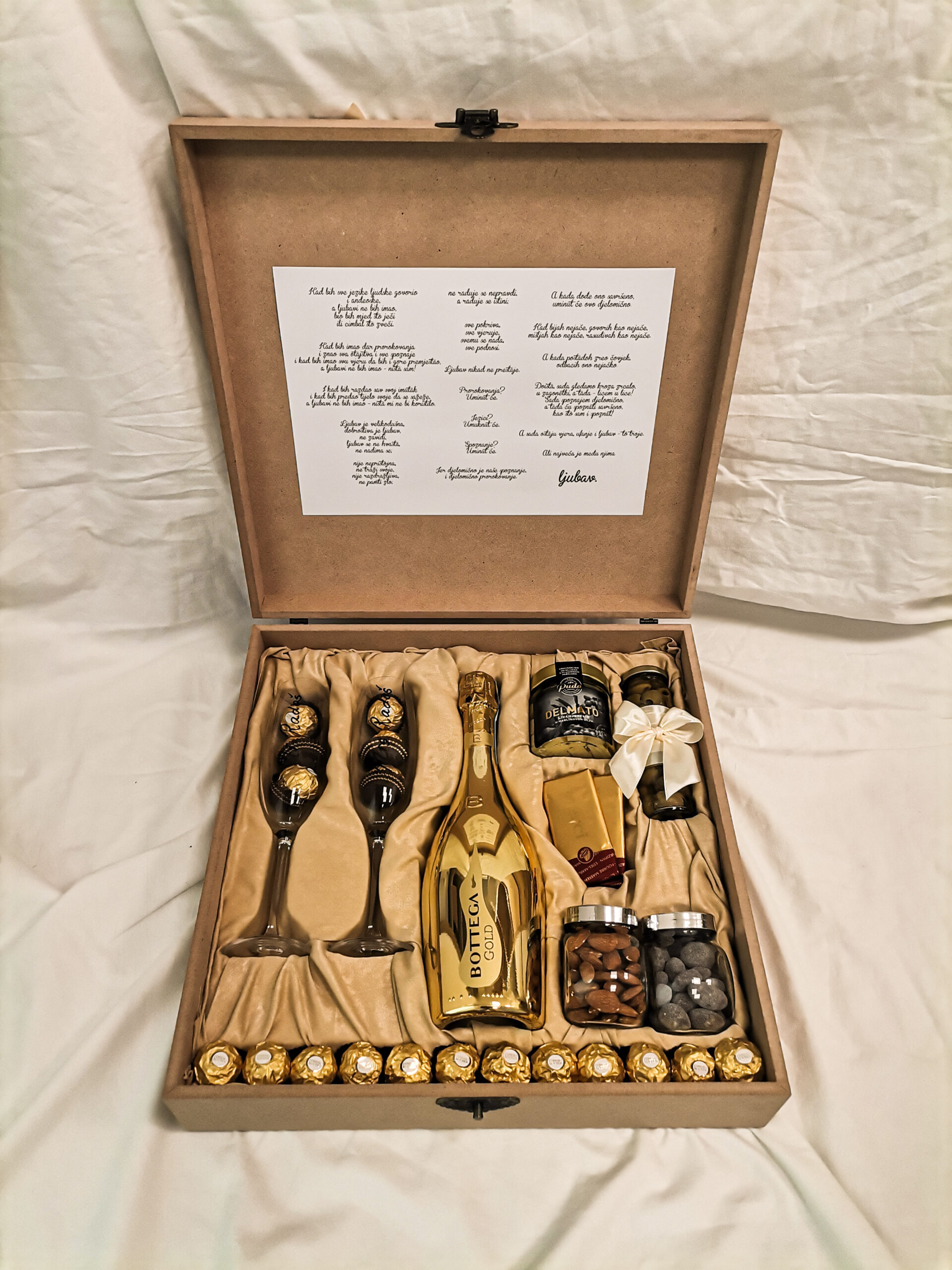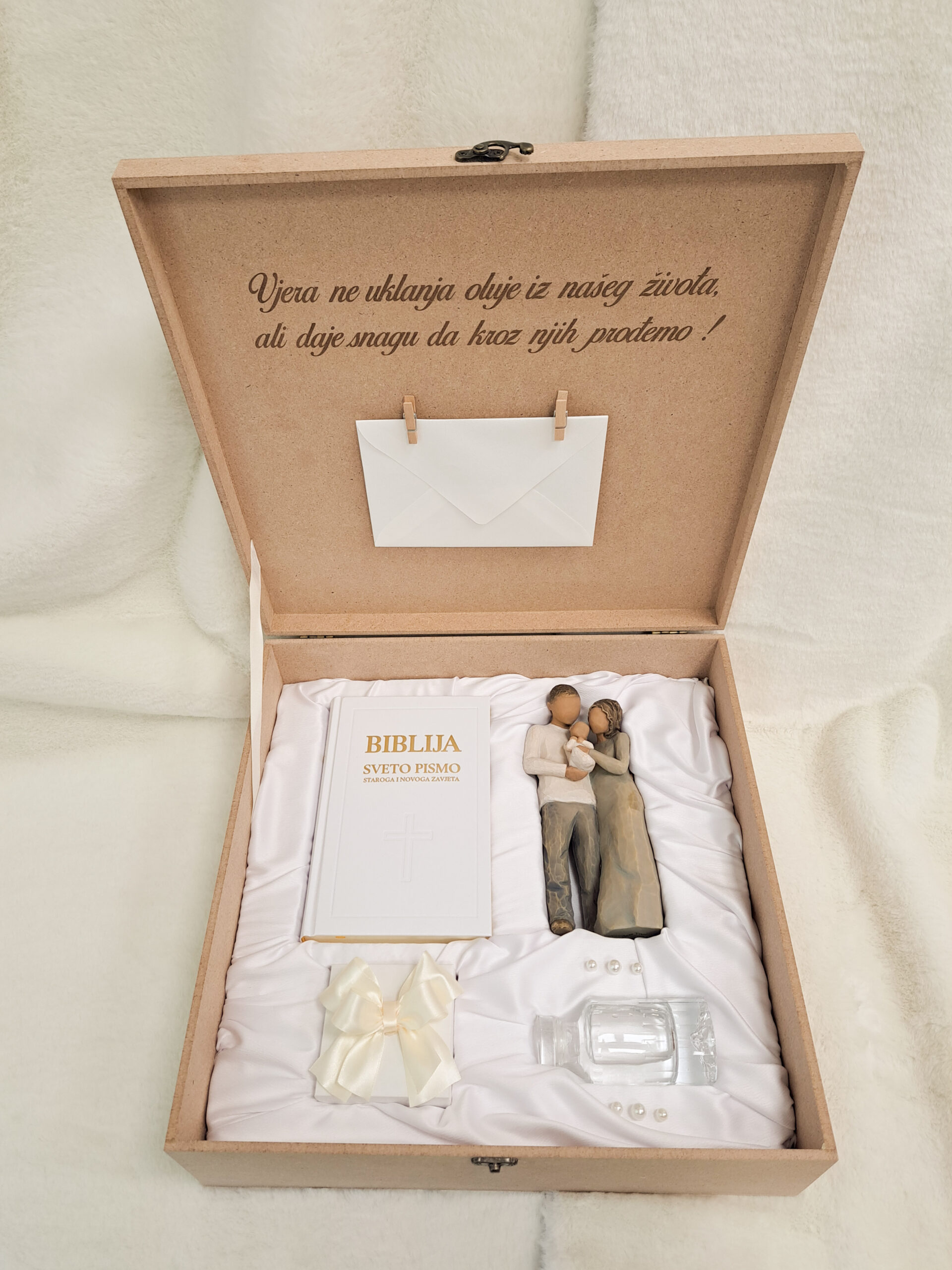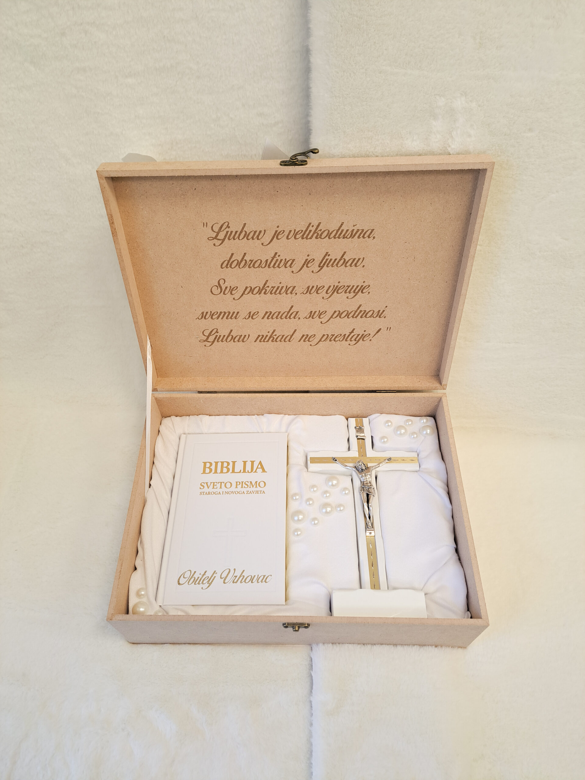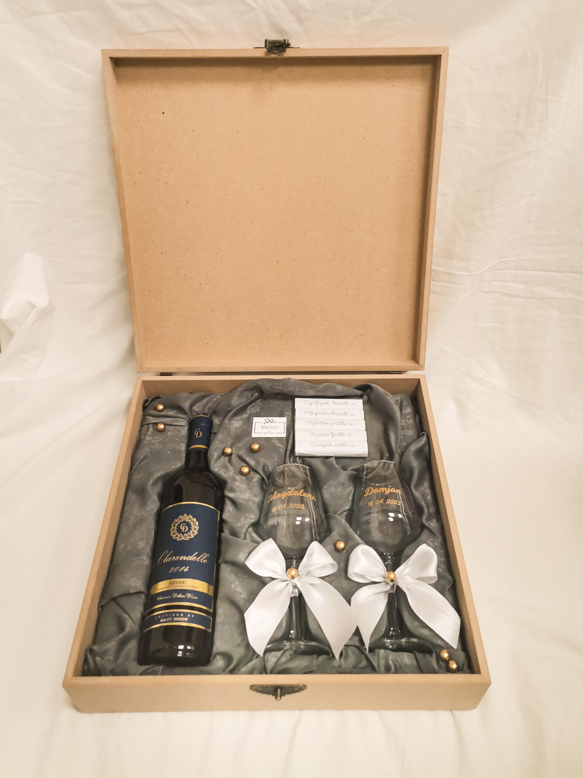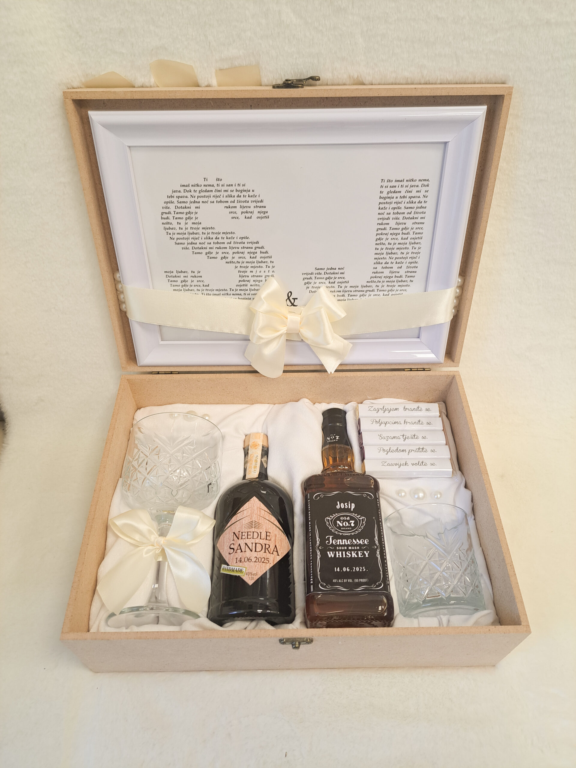 Poklon paketi za vjenčanje najčešće uključuju: Bibliju, križ,krunicu, svijeću. Sljedeća najčešće birana opcija su pokloni sa pićima, čašama i slatkišima i/ili drugim delikatesama, a mogu sadržavati i neki konkretniji poklon za mladence poput parfema ili nakita. Svaki detalj je pažljivo osmišljen i izrađen. Poklone pakiramo u luksuzne kutije i nudimo mogućnost potpunog brendiranja i personalizacije.